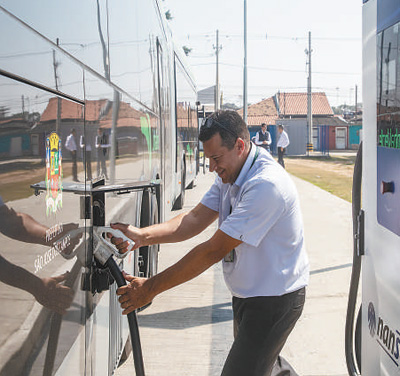 巴西圣保罗州圣若泽杜斯坎普斯拥有该国首个纯电动城市快速公交系统。12台22米长的比亚迪纯电动铰链式大巴为该系统提供服务。图为当地工作人员在为比亚迪纯电动大巴充电。