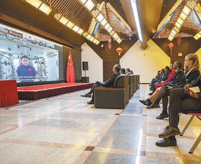 2022年9月,在南非比勒陀利亚拍摄的“天宫对话”活动南非分会场,来自埃塞俄比亚、埃及等非洲8国的青少年通过网络视频与在中国空间站执行任务的神舟十四号航天员进行“天宫对话”活动。