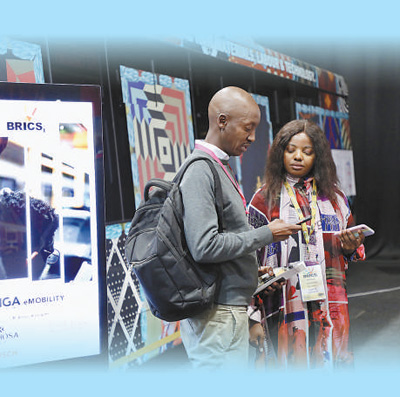 8月19日—23日,金砖国家贸易博览会在南非约翰内斯堡举办,吸引来自金砖国家和非洲国家的参展商参展。图为参观者向工作人员咨询信息。