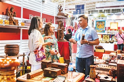 图为第七届中国—南亚博览会尼泊尔展区的参展商(右)在推介特色商品。