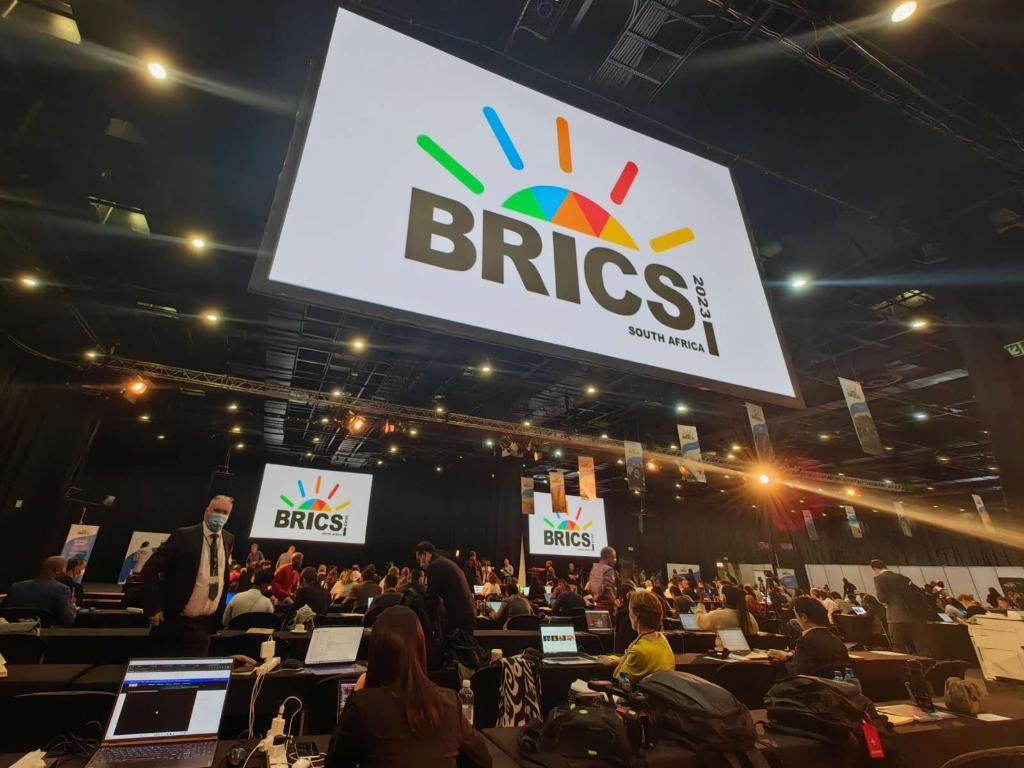 8月23日,金砖会晤的新闻中心内汇聚了大批记者。