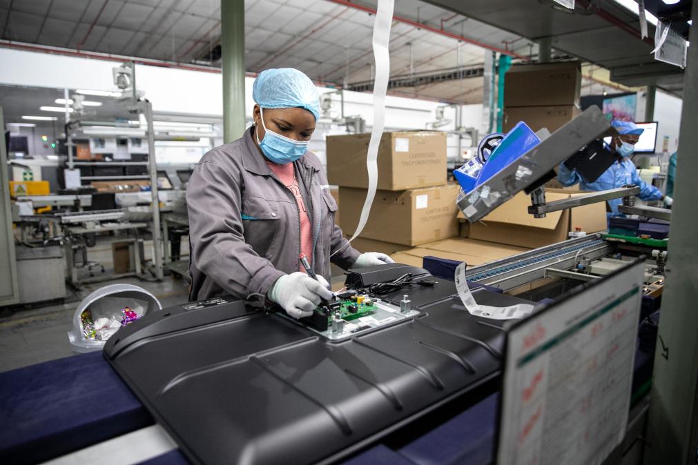 当地员工在南非开普敦海信南非工业园的电视机生产线上工作。
