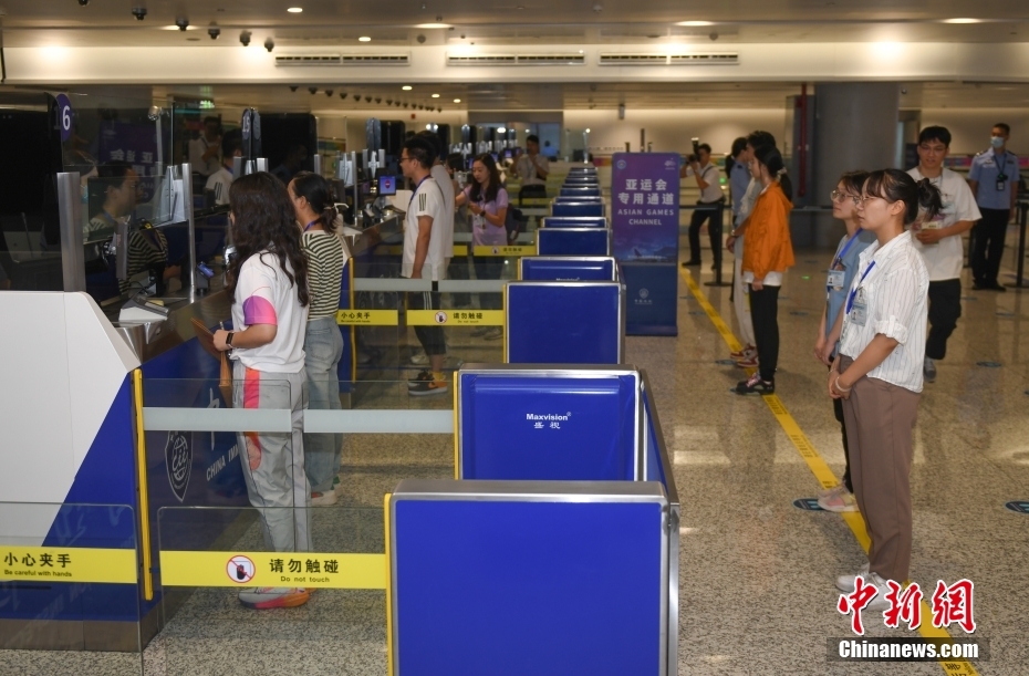8月29日,模拟境外代表团的人员进入杭州机场。当日,浙江杭州机场开展杭州亚运会“赛时一天”集中抵离压力测试,三支模拟的境外代表团共300余人在1小时内通过机场“亚运会专用通道”,完成卫生检疫、边防检查、海关查验、注册卡激活、行李提取等入境流程,从机场进入城市。