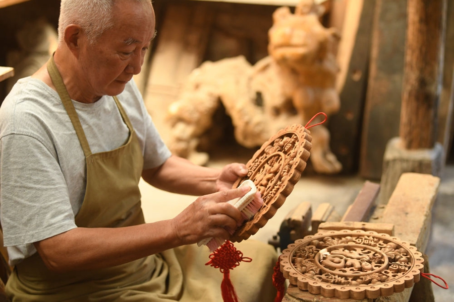 一名木工在诸葛村清理作品(2023年8月1日摄)。新华社记者 翁忻旸 摄