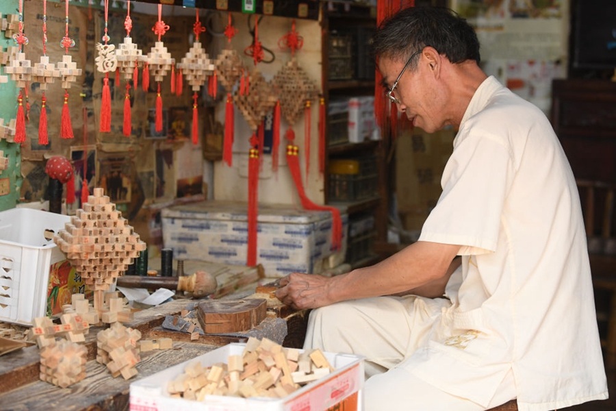 非遗传承人在诸葛村制作孔明锁(2023年8月1日摄)。新华社记者 翁忻旸 摄