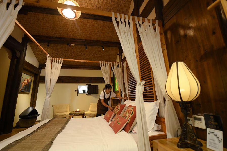 诸葛村一家民宿的工作人员在整理房间(2023年8月1日摄)。新华社记者 翁忻旸 摄