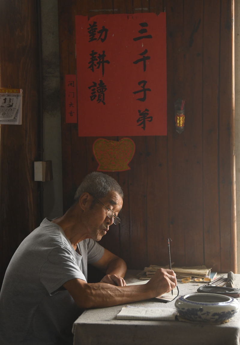 诸葛村的村民在家中写扇面(2023年8月1日摄)。新华社记者 翁忻旸 摄