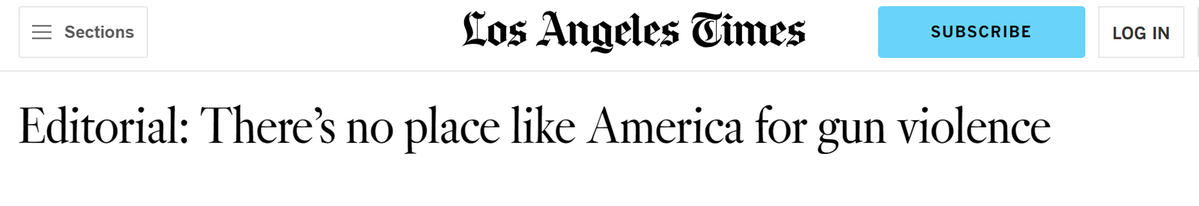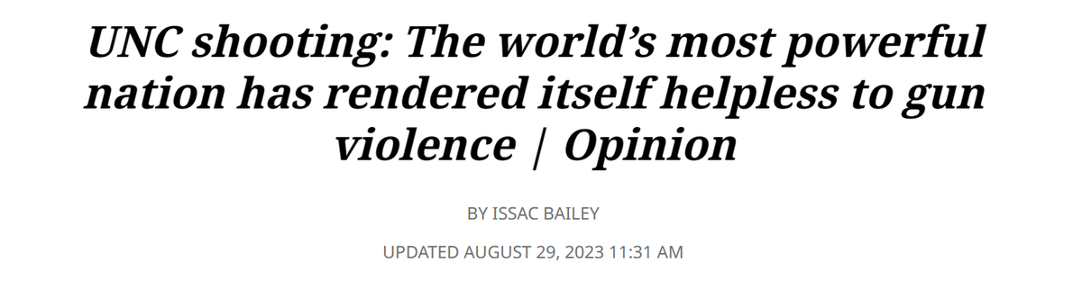 文章讽刺说,在美国,有税收,有死亡,也会有下一个突发事件——一名枪手在学校、商场、杂货店等等场所不受约束地自由行动。“我知道如果又有一个枪手出现在我工作的地方,我应该采取怎样的紧急措施,就像太阳从东边升起一样,肯定还会有下一个枪手出现。”