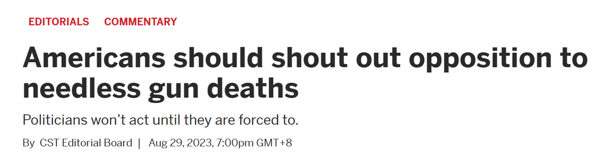 文章认为,当美国的政客们拒绝采取任何措施应对枪支暴力,甚至通过撤销旨在减少暴力流血事件的法律,令情况变得更糟糕的时候,应该有越来越多各界各方的美国人表达反对意见。