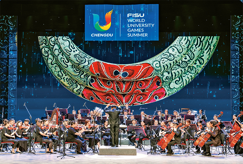 图为2023年7月30日,音乐家在为参加成都大运会的各代表团成员演奏《瑶族舞曲》。 新华社记者 沈伯韩/摄