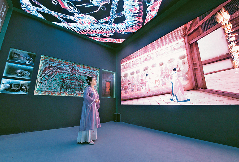 图为2023年6月8日,一名身着传统服饰的观众在第十九届中国(深圳)国际文化产业博览交易会甘肃展台观看数字敦煌展览。 新华社记者 梁旭/摄