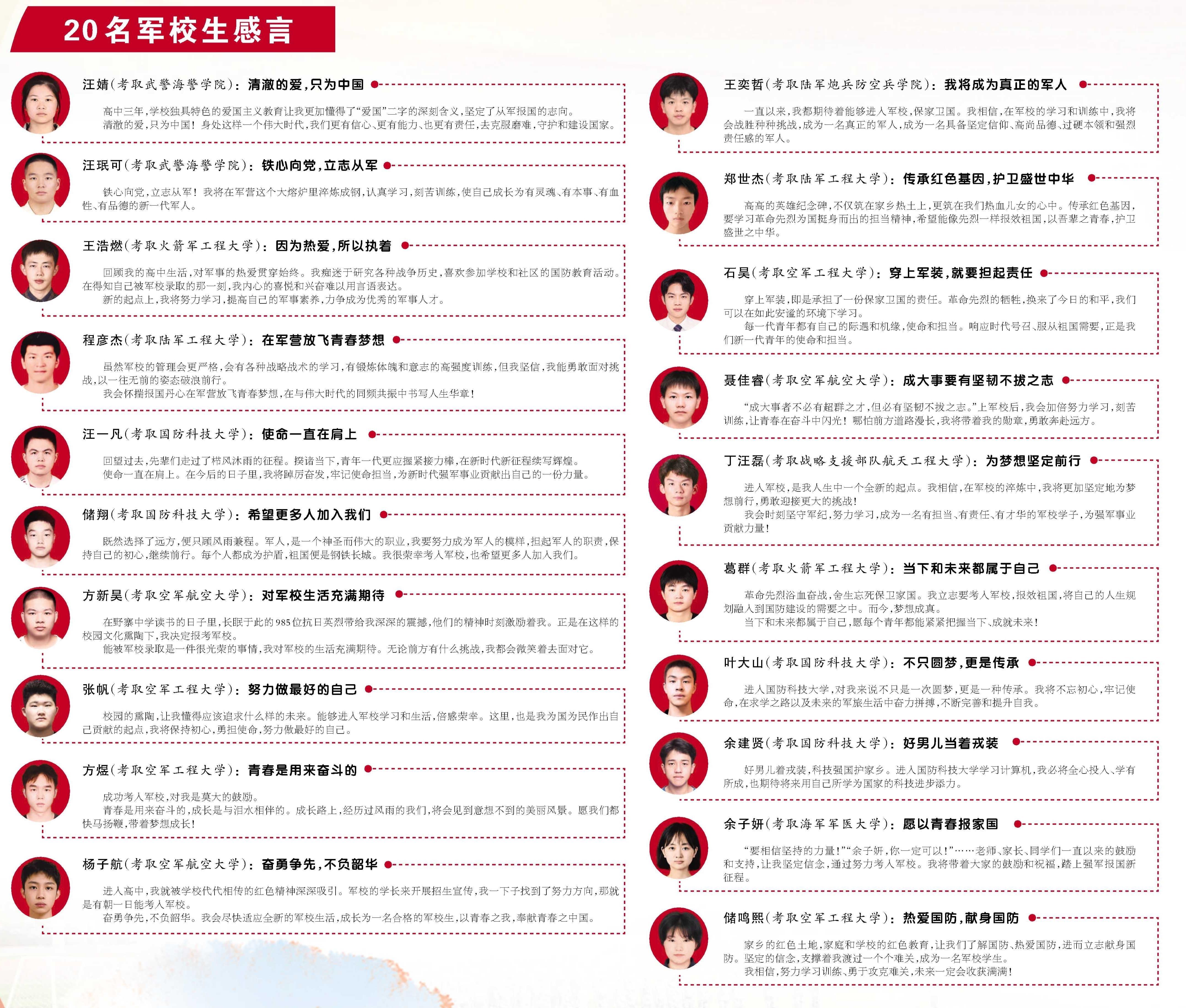 20名学生每人写了一段心里话,表达他们即将成为军人的自豪和光荣,并表示学成毕业之际,恰逢建军100周年,一定会保卫好祖国,做到“强国有我”。