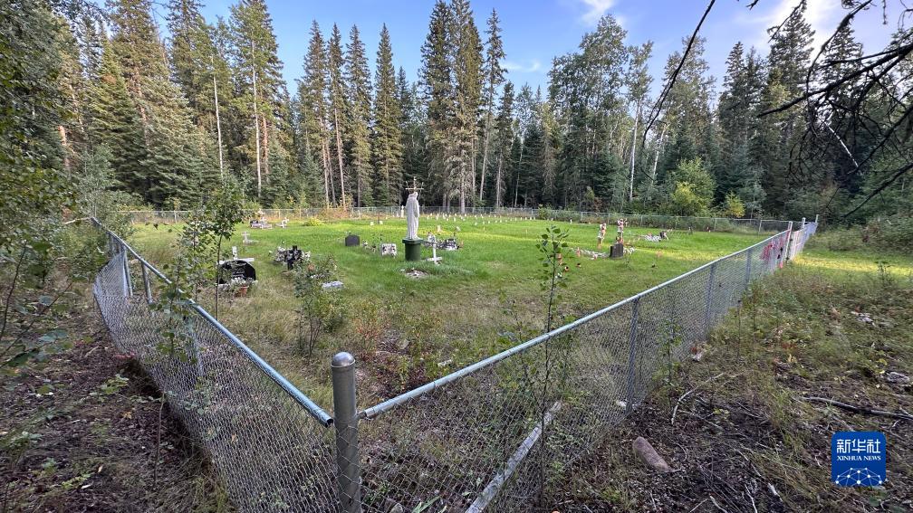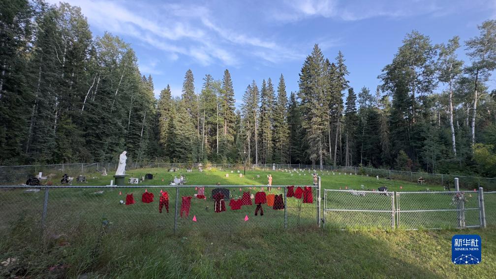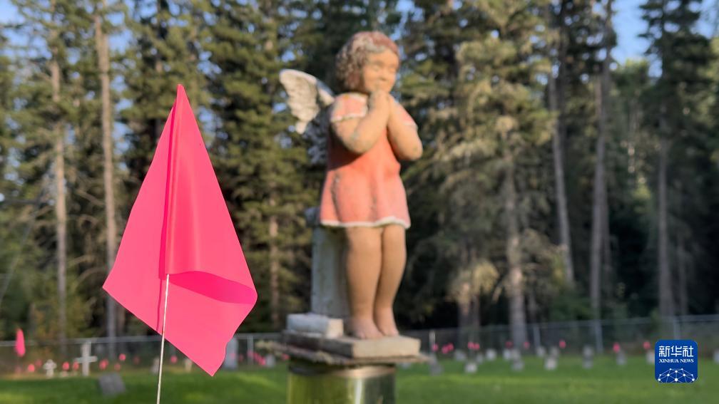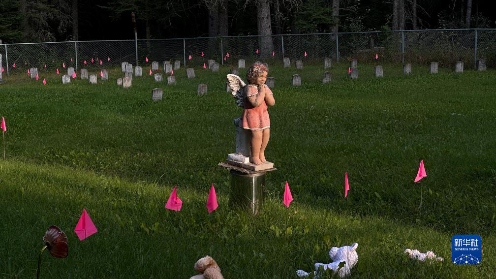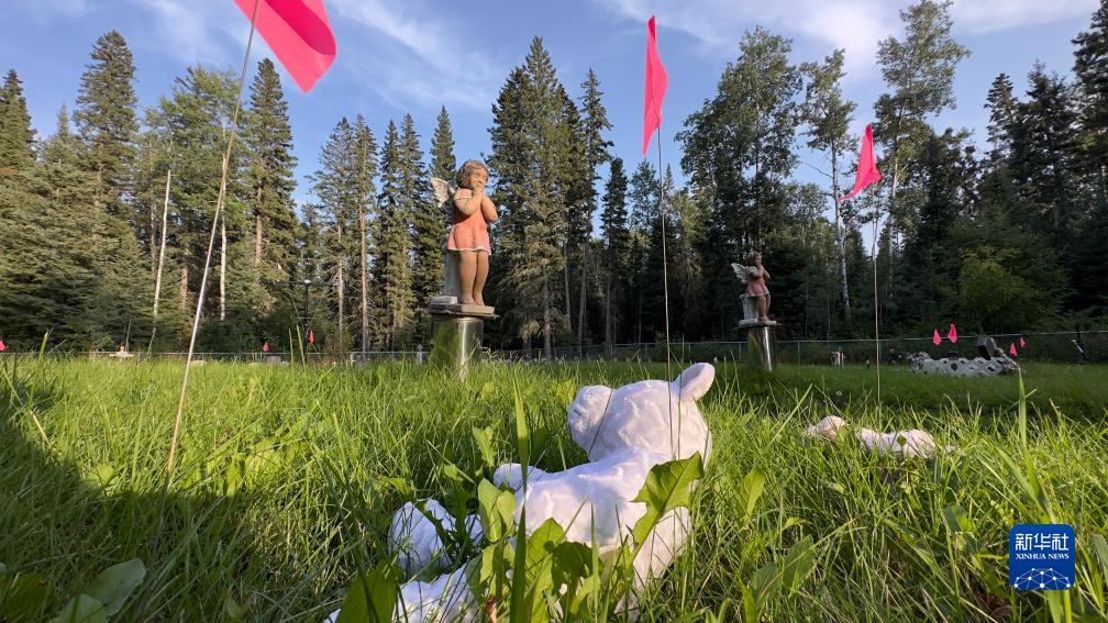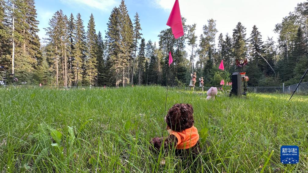这是8月31日在加拿大萨斯喀彻温省博瓦尔印第安人寄宿学校旧址拍摄的用粉色旗子标出的疑似儿童或婴儿墓地。