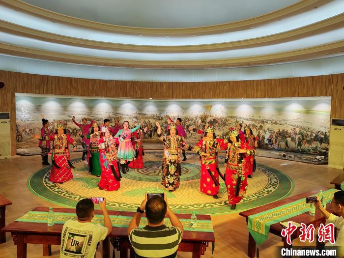 在博湖县蒙古族非遗传承保护中心,民间艺人们身穿华丽的民族服饰,伴随着欢快的音乐,抖肩、弯腰、翻掌,表演萨吾尔登舞蹈,惟妙惟肖的舞姿、欢快强劲的节奏,为现场观众带来了一场精彩绝伦的视觉盛宴。