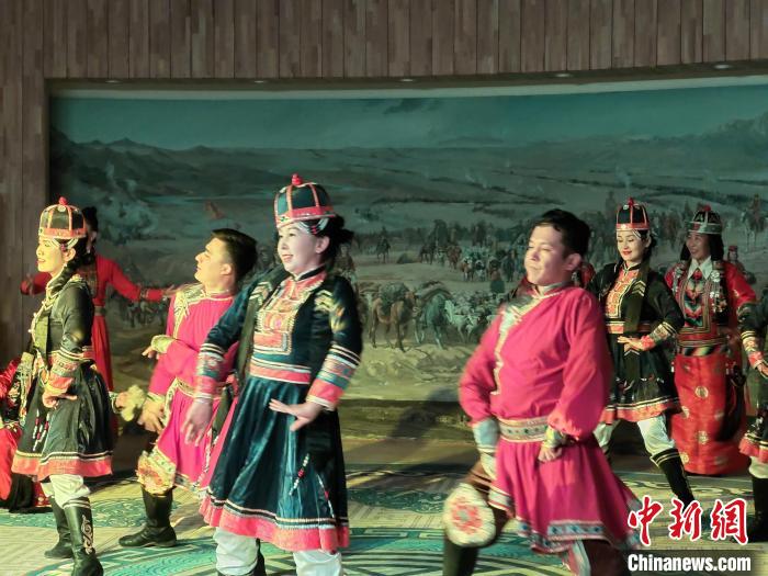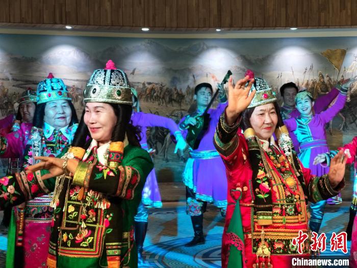 在博湖县蒙古族非遗传承保护中心,民间艺人们身穿华丽的民族服饰,伴随着欢快的音乐,抖肩、弯腰、翻掌,表演萨吾尔登舞蹈。(