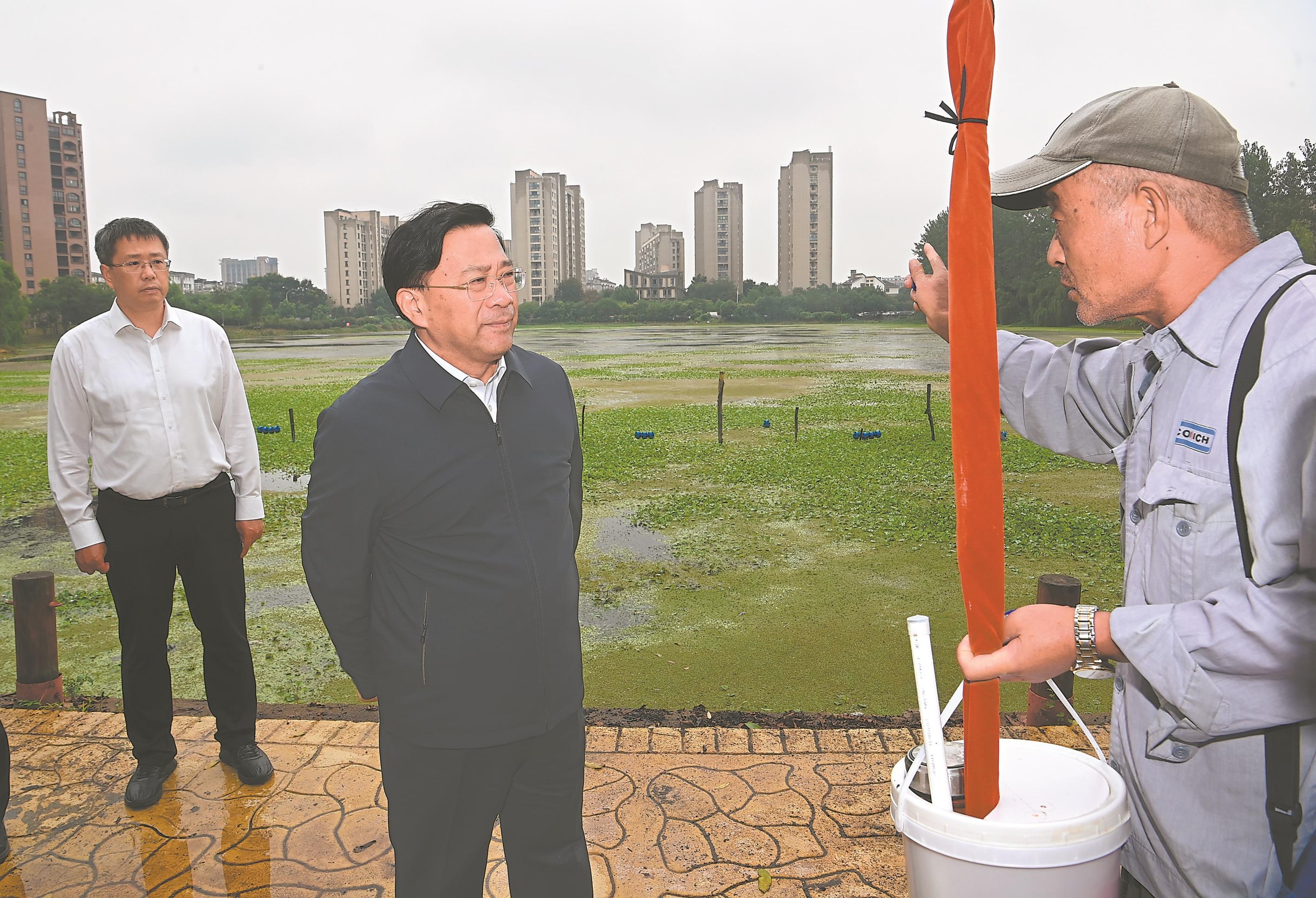 9月22日上午,省委书记韩俊在芜湖市镜湖区莲花湖水域,采取“四不两直”方式暗访督导生态环境保护工作,向路过群众询问水质情况并认真听取意见建议。本报记者 杨 竹 摄