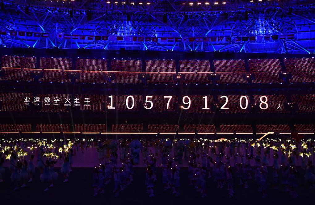 这是9月23日拍摄的开幕式现场显示的亚运数字火炬手人数。新华社记者 黄宗治 摄