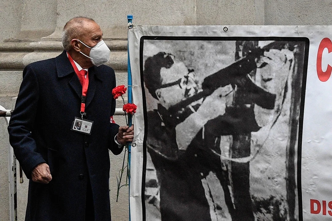 2022年9月11日,智利首都圣地亚哥,一名男子手执红色康乃馨悼念智利前总统萨尔瓦多·阿连德遇难49周年。新华社发(豪尔赫·比列加斯摄)