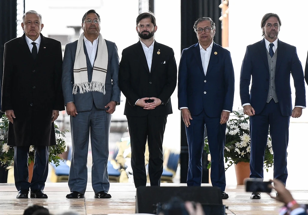 9月11日,在智利首都圣地亚哥,墨西哥、玻利维亚、智利、哥伦比亚和乌拉圭5国总统共同出席悼念1973年智利政变遇难者的活动。新华社发(豪尔赫·比列加斯摄)