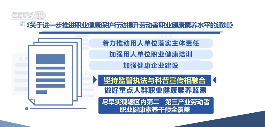 《通知》指出,着力推动用人单位落实主体责任,加强用人单位职业健康培训,加强健康企业建设。坚持监管执法与科普宣传相融合,做好重点人群职业健康素养监测,尽早实现辖区内第二、第三产业劳动者职业健康素养干预全覆盖。发挥专业机构作用,推进职业健康知识进机构、进企业、进学校、进乡村、进社区“五进”活动。各级职业病防治机构、疾控中心要发挥科普宣传主力军作用,普及职业健康知识,探索建立科普宣传工作激励机制。鼓励第二、第三产业劳动者集中的地区建设职业健康体验场馆等科普宣传阵地,建设省级职业健康科普资源库。