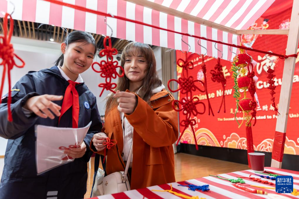 在复旦大学第二附属学校,校民乐团为远道而来的朋友准备了《步步高》等中国传统乐曲演奏表演。两国学生还分为四组,围成圆圈席地而坐做游戏,根据手中卡片的提示分享彼此的兴趣爱好。两国学生你一言、我一语,在交流互动中增进友谊。游戏过后,学生们还体验了剪纸、编中国结、包春卷等传统习俗。