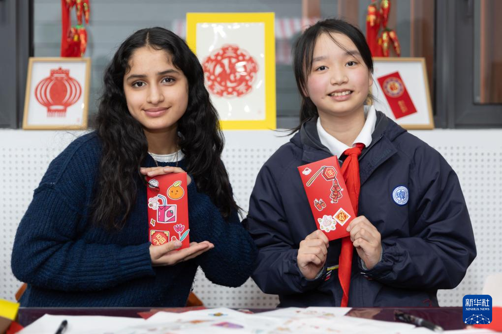1月28日,美国马斯卡廷中学学生(左)和复旦大学第二附属学校学生展示互相送出的写有寄语祝福的红包。 新华社记者 王翔 摄