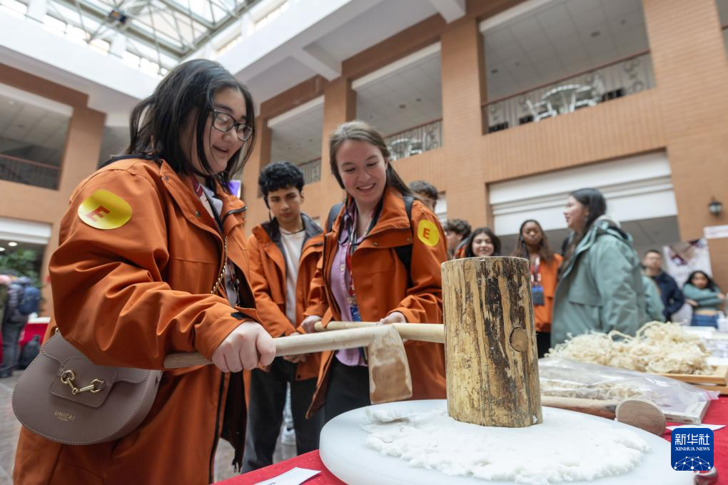 1月29日,在复旦大学,美国马斯卡廷中学学生用锤子打纸浆,亲身体验古法制作纸张。 新华社记者 王翔 摄