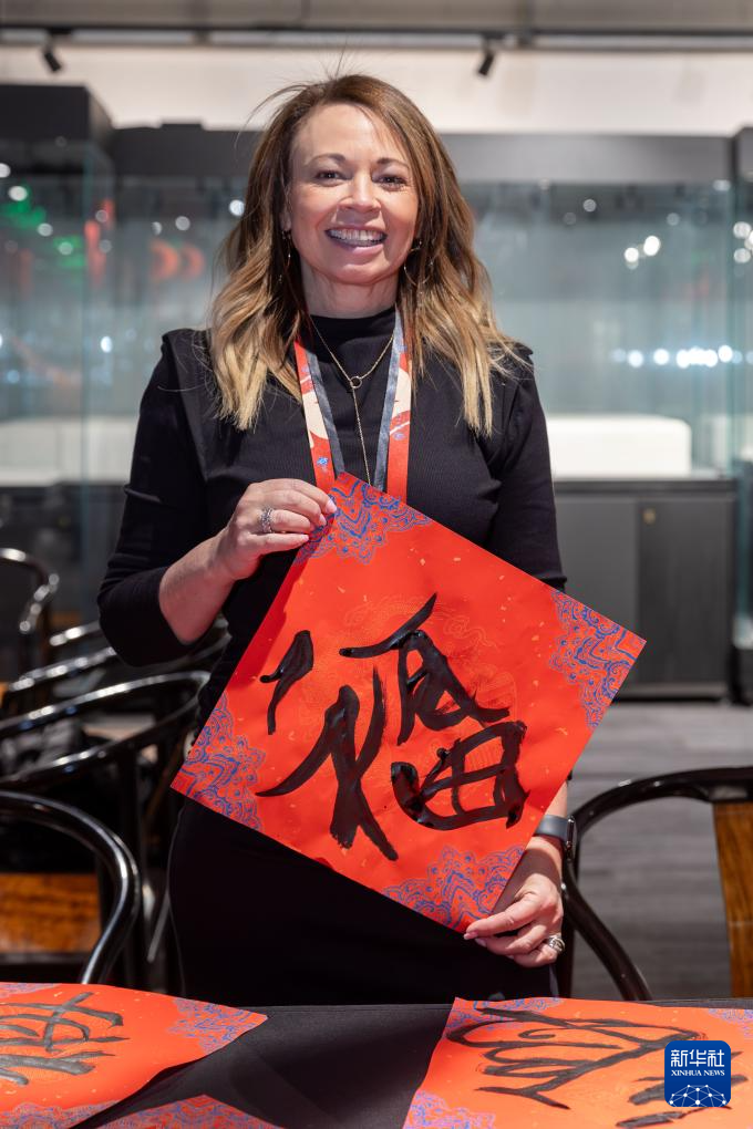 1月28日,在上海豫园举行的民俗活动上,美国马斯卡廷初中校长珍妮弗·李·弗里德利展示自己写下的“福”字。 新华社记者 王翔 摄