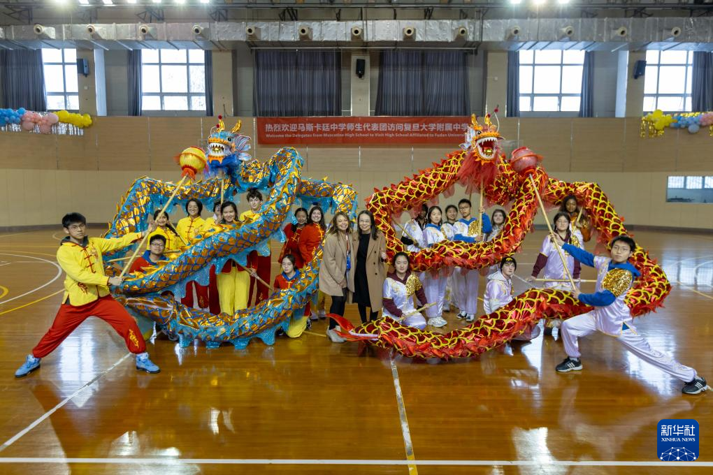 1月29日,在复旦大学附属中学,美国马斯卡廷中学学生参加舞龙体验活动。 新华社记者 王翔 摄