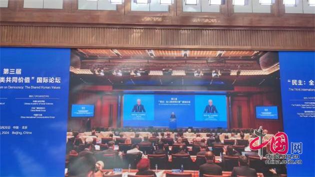 中国网3月21日讯(记者 彭瑶)3月20日,第三届“民主:全人类共同价值”国际论坛在北京举办,来自多个国家、地区和国际组织的200余名嘉宾共商民主真谛和互鉴之道。本届论坛由中共中央宣传部、国务院新闻办公室主办,中国社会科学院、中央广播电视总台、中国外文局承办。
