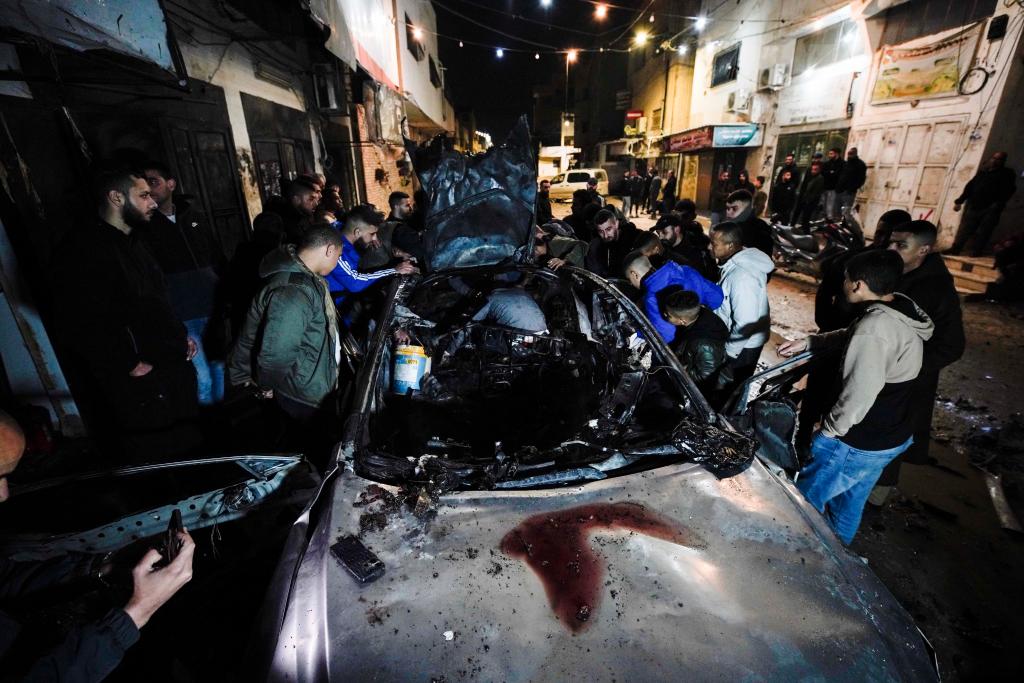 2月22日,人们在约旦河西岸城市杰宁查看遭以军无人机空袭的汽车。新华社发