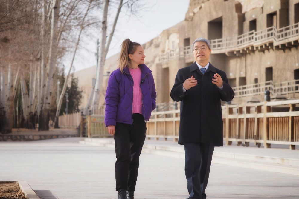 ??3月16日,新华社外籍记者达莎在莫高窟前同敦煌研究院党委书记赵声良交流。新华社记者赵宇摄