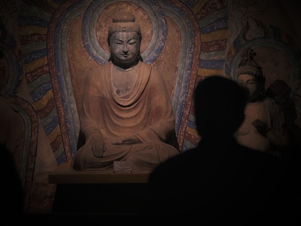 ??3月11日,游客在甘肃省博物馆观看展出的唐代佛像。新华社记者赵宇摄