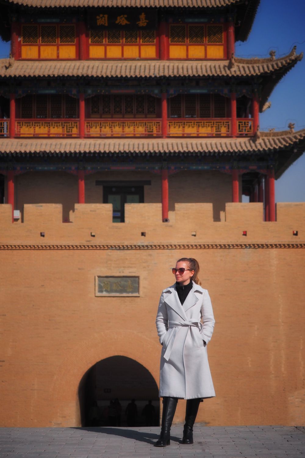 ??3月14日,新华社外籍记者达莎在甘肃嘉峪关城楼前。新华社记者赵宇摄