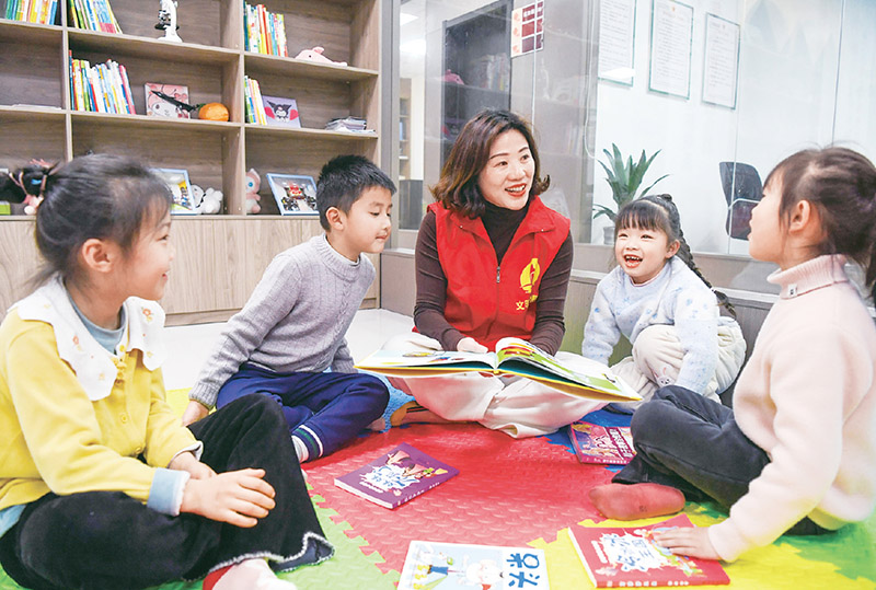 近年来,江西省丰城市在社区建设“一老一小”幸福院,让群众养老托育“离家不离社区”。图为2024年3月11日,在河洲街道和合社区“一老一小”幸福院,志愿者在给孩子们讲绘本故事。 新华社发 周亮/摄