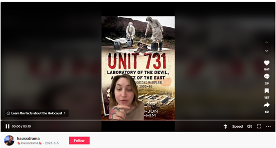 于是美国网民被震惊了,日本和美国作战时犯下的罪行,远不是日军的最下限,于是为了声讨日军这些在美国鲜为人知的战争罪行,许多博主把自己了解的更多历史做成科普视频发去了TikTok。