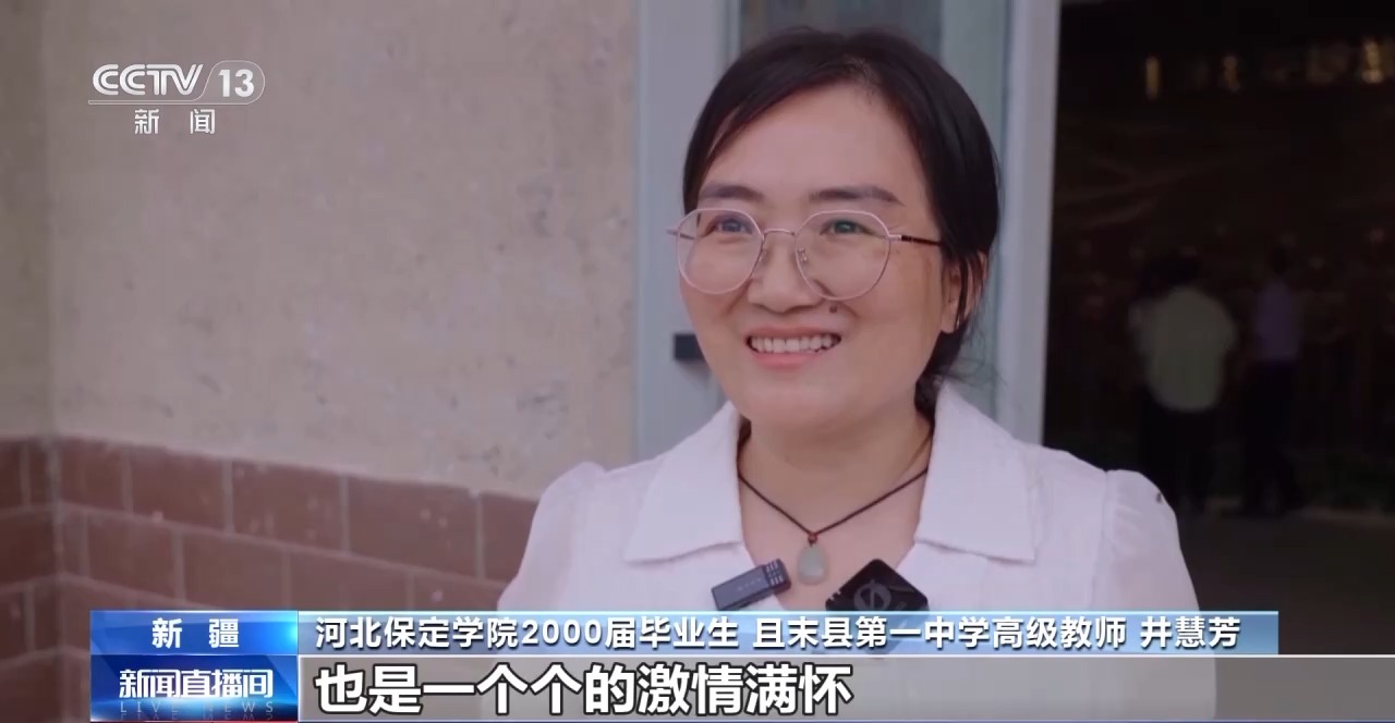 河北保定学院2000届毕业生 且末县第一中学高级教师井慧芳:让我们想到了我们当年来的时候,也是一个个的激情满怀。4个女同学、11个男同学,扛着到“西部教书去”的大旗,经过5天4夜辗转,才从保定来到了新疆且末。我们来的那天,且末县二中的领导和老师们,亲自从河坝里面一桶水、一桶水地提上来,净水泼街,欢迎我们。