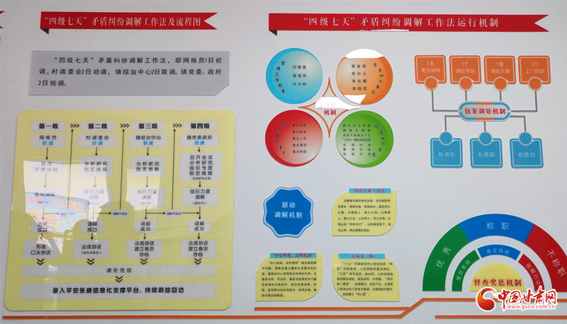 网格员初调:手持终端“一键上报”,1天内就地化解;村调委会劝调:乡贤、“三官一师”齐上阵,2天内情理交融;镇综治中心联调:“中心吹哨、部门报到”,2天内集中“会诊”;镇党委政府统调:专班下沉、县直联动,2天内“案结事了”。