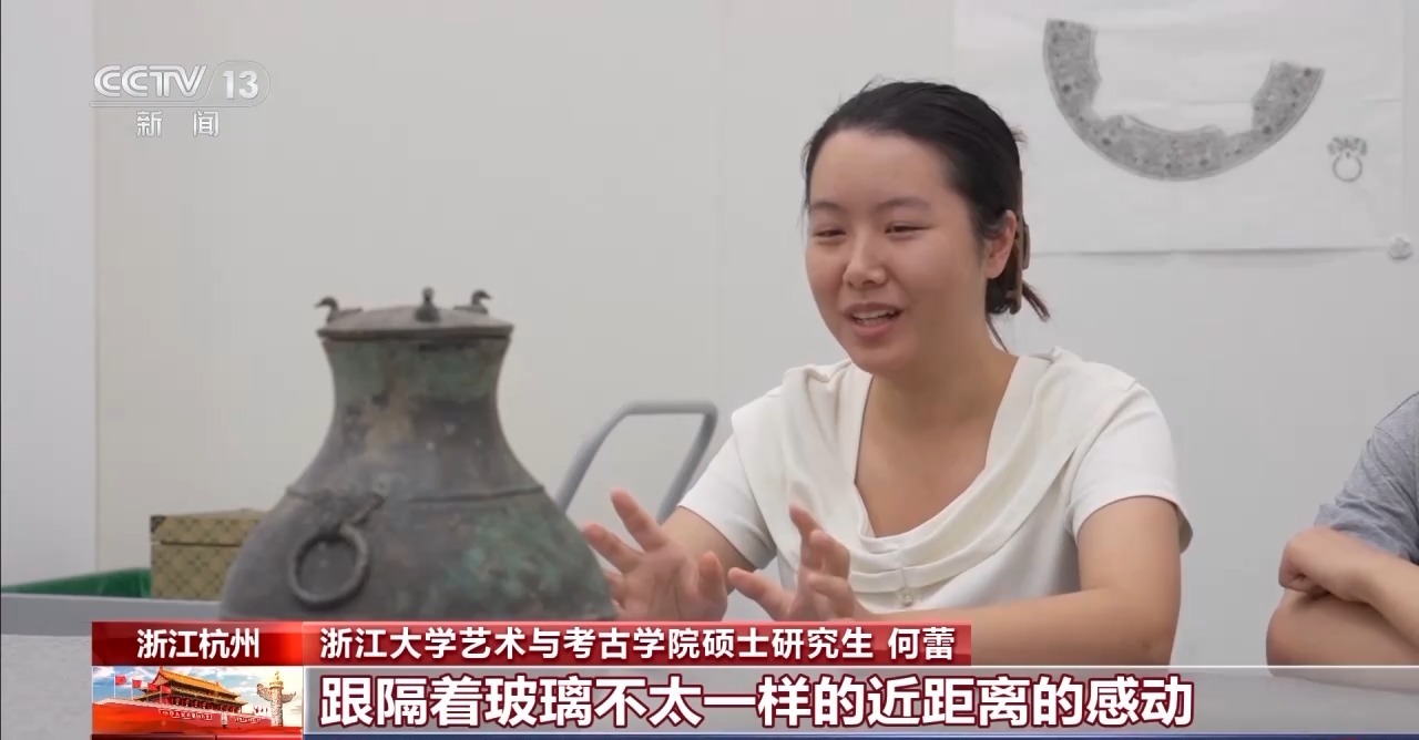 浙江大学艺术与考古学院硕士研究生 何蕾:跟隔着玻璃不太一样的近距离的感动,我像是握住了一根细绳,而绳的那一边是我们几千年前祖先的脉搏和心跳。当时进入这个专业的初心,也是为了让更多的人像我一样热泪盈眶地去看文物,希望我以后能将这种感动带给更多的人。
