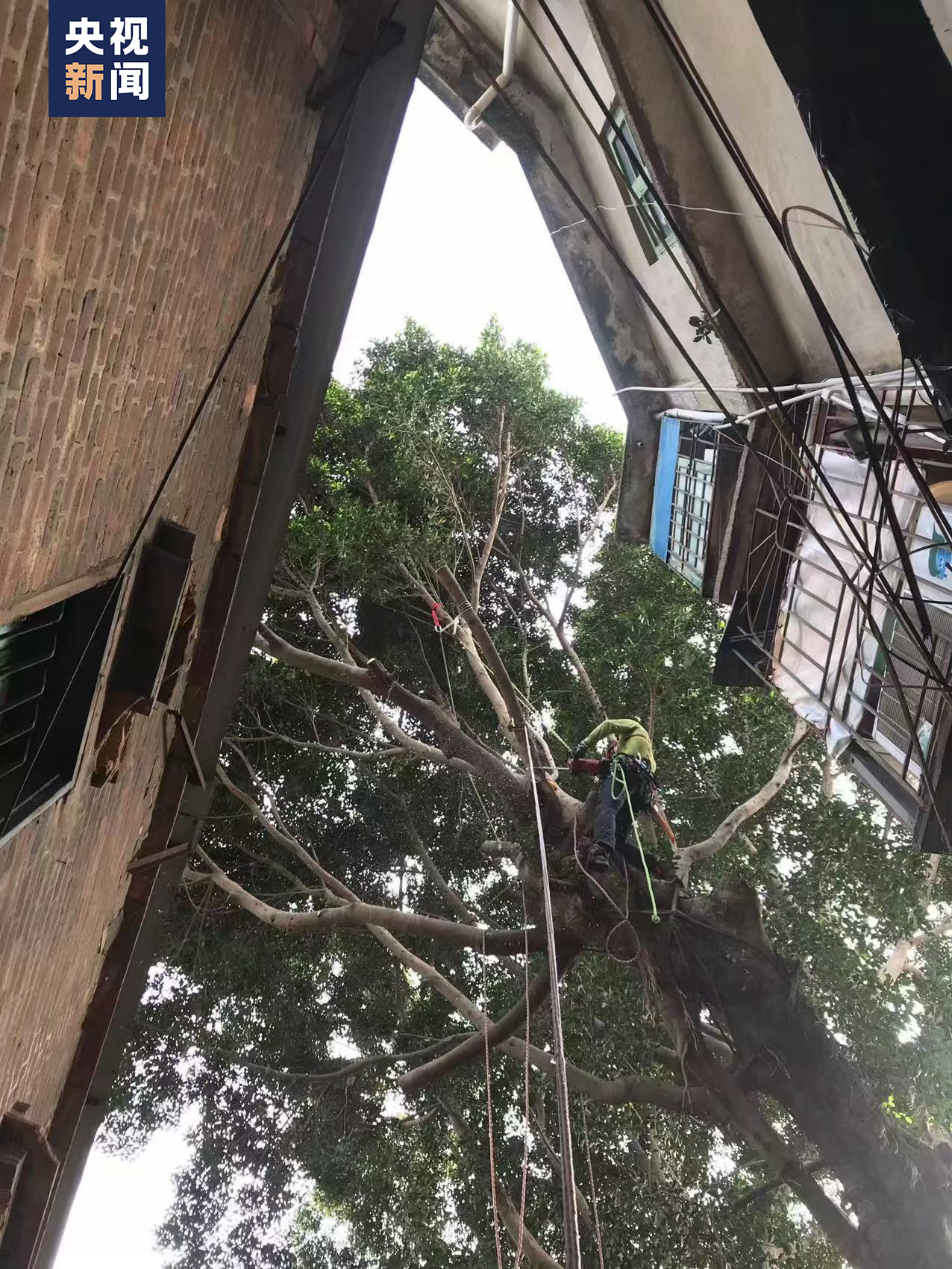 但常年生活在榕树之下,遮天蔽日,导致周边房屋潮湿发霉。这时,就需要攀树师上树修剪。