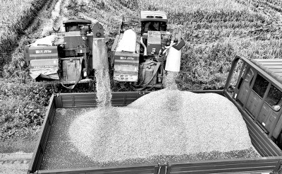 农机在四川农业大学科技示范点卸装收获的香稻。新华社发