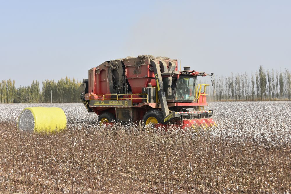 ??10月21日,采棉机在新疆阿克苏地区沙雅县的棉田中工作,旁边是刚采收打包好的棉花。新华社记者贾钊 摄