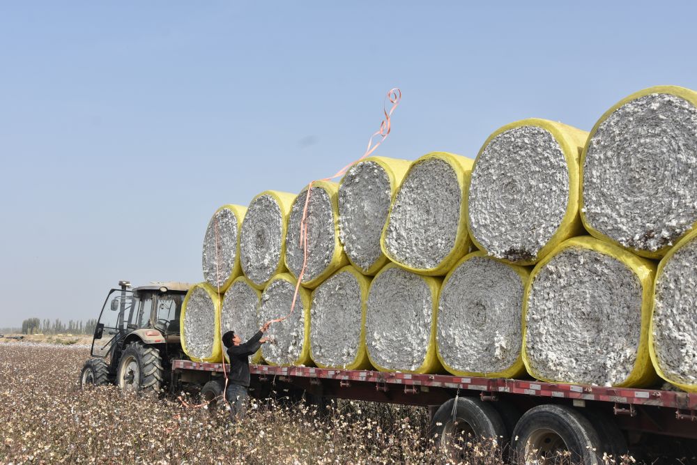 ??10月21日,在新疆阿克苏地区沙雅县的棉田中,棉农在固定棉花包。新华社记者顾煜 摄