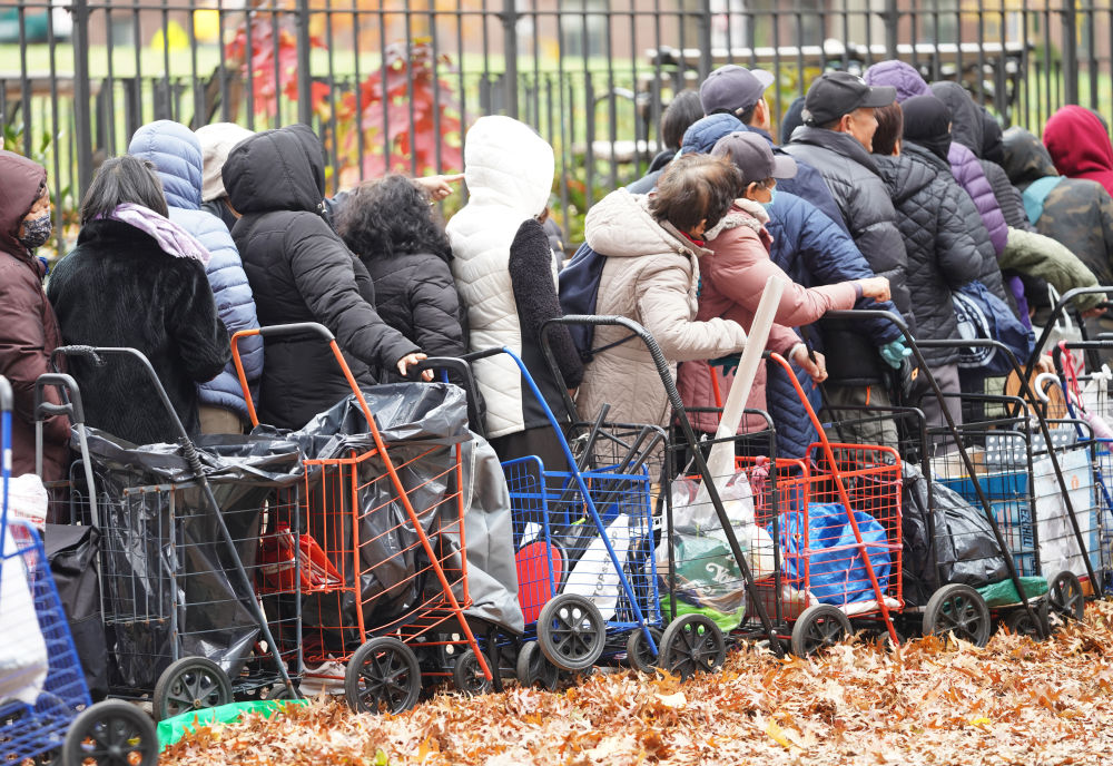 ??11月12日,人们在美国纽约一处食物发放点等待领取食物。新华社记者张凤国摄
