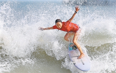 海南队选手在冲浪项目女子短板比赛中。