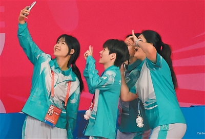 广州体育学院亚运篮球馆,志愿者在结束工作后自拍留念。