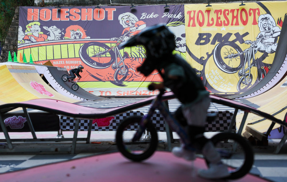 ??10月31日,在位于深圳福田区的HOLE SHOT骑行公园,小朋友们练习小轮车。新华社记者 胡星宇 摄