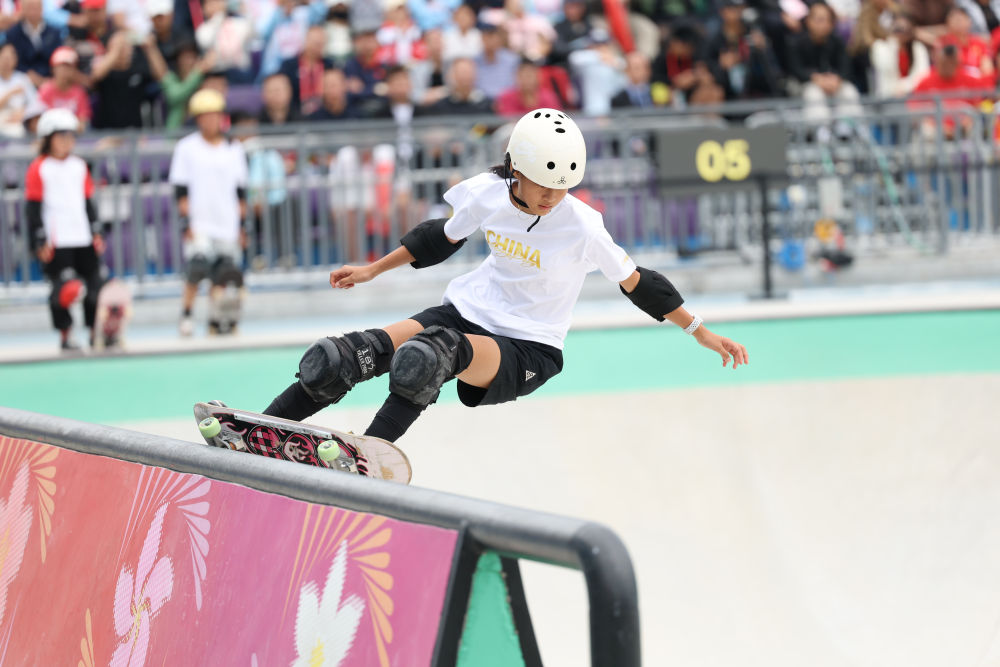 ??2023年11月4日,第一届全国学生(青年)运动会滑板女子碗池决赛在广西北海举行,郑好好获得亚军。新华社记者 胡星宇 摄