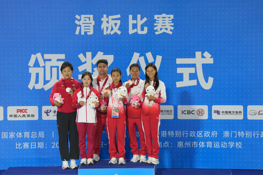 ??11月11日,第十五届全国运动会滑板项目女子碗池赛决赛在广东惠州举行。冠军广东队选手邹明珂(右三)、亚军山东队选手孟令妍(左二)、季军广东队选手郑好好(右一)和教练在颁奖仪式上合影。新华社记者 刘坤 摄