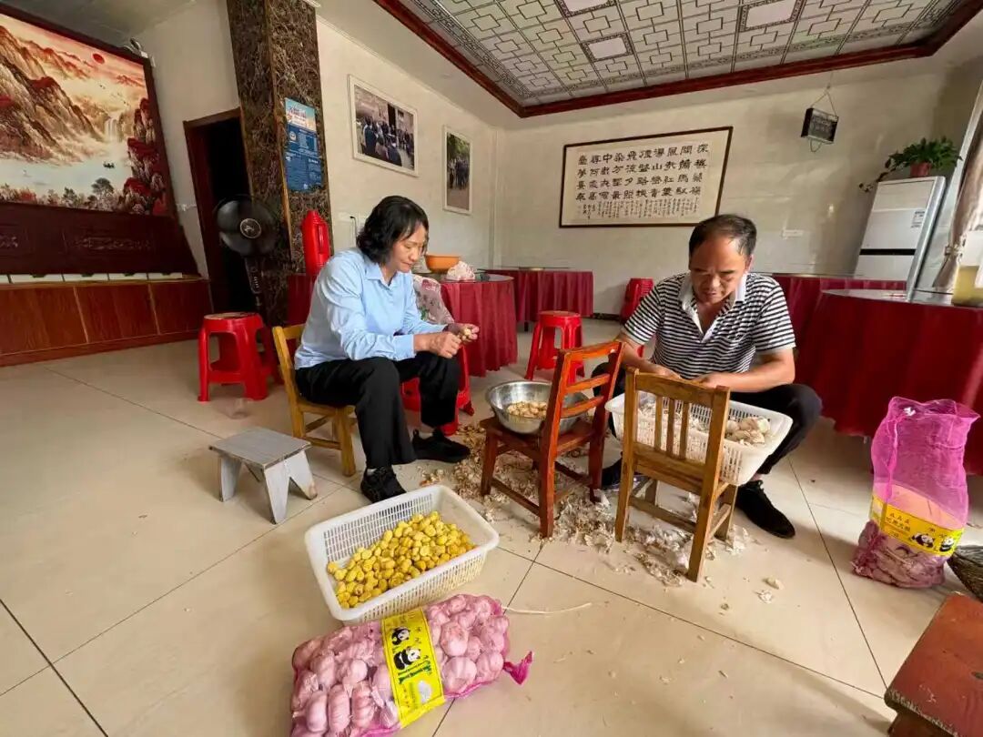 大湾村党支部书记何家枝(左)与村民剥板栗、话家常。